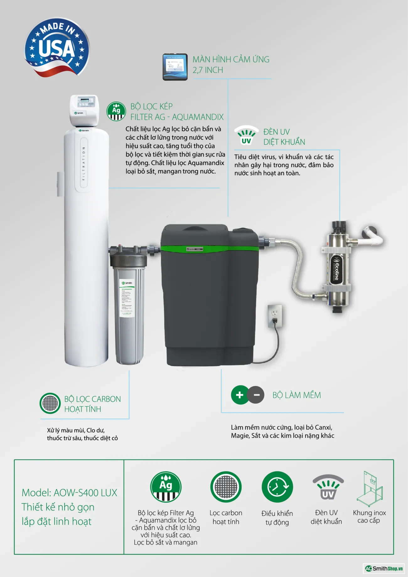 BỘ LỌC THÔ TỰ LÀM SẠCH Loại bỏ cặn bẩn và bùn đất trong nước. Vật liệu KDF xử lý kim loại nặng (Cu, As, Pb, Al), giúp giảm mùi Clo dư và vị khó chịu trong nước. |