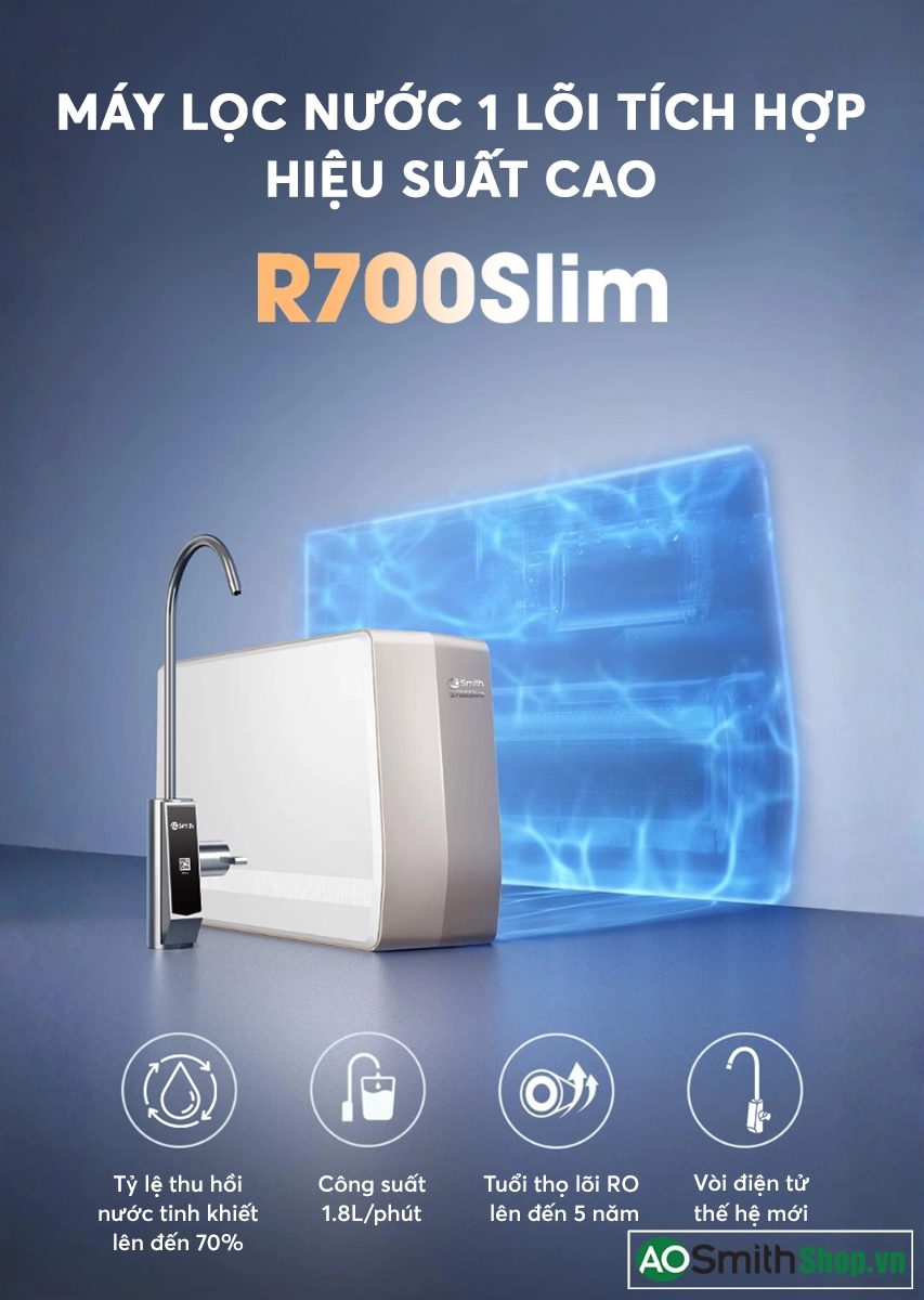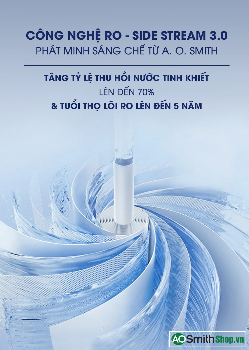 Công nghệ RO - Side Stream 3.0 từ A. O. Smith Màng lọc RO – Side Stream mới có tuổi thọ lên đến 5 năm, tăng khả năng thu hồi nước tinh khiết lên 70%, cao nhất trong ngành. |