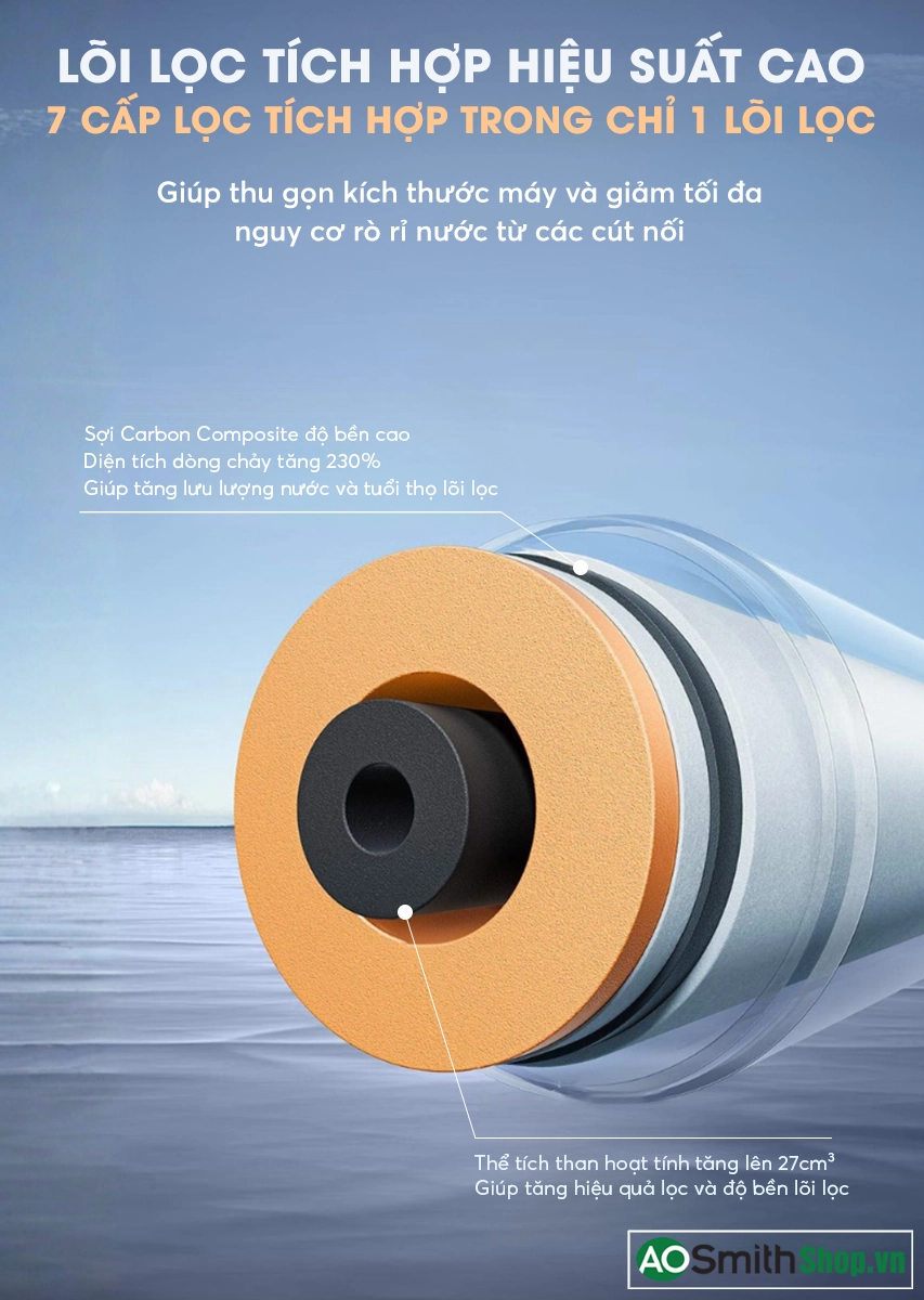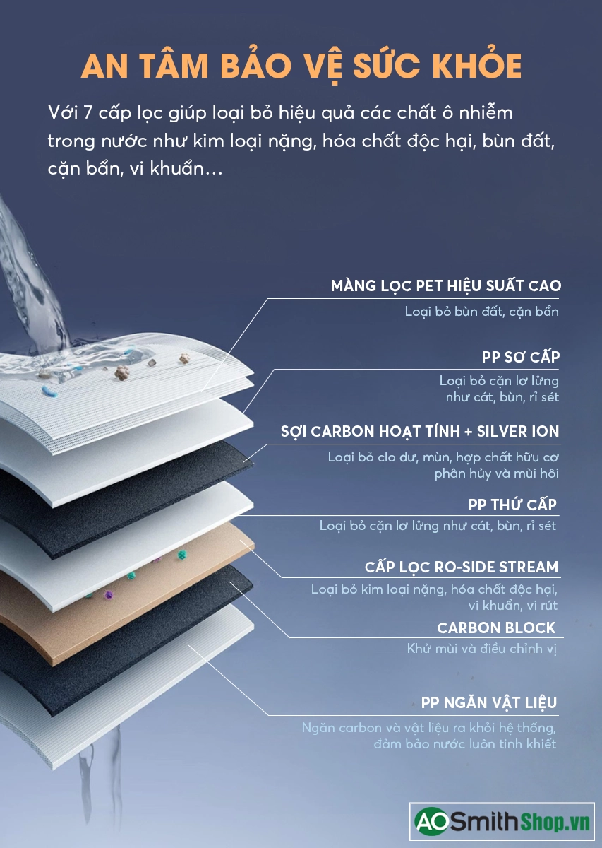 Bộ lọc 7 in 1 Gồm 7 cấp lọc trong 1 lõi, loại bỏ tạp chất, vi khuẩn, virus, kháng sinh và kim loại nặng, đảm bảo nước sạch, an toàn cho sức khỏe. |