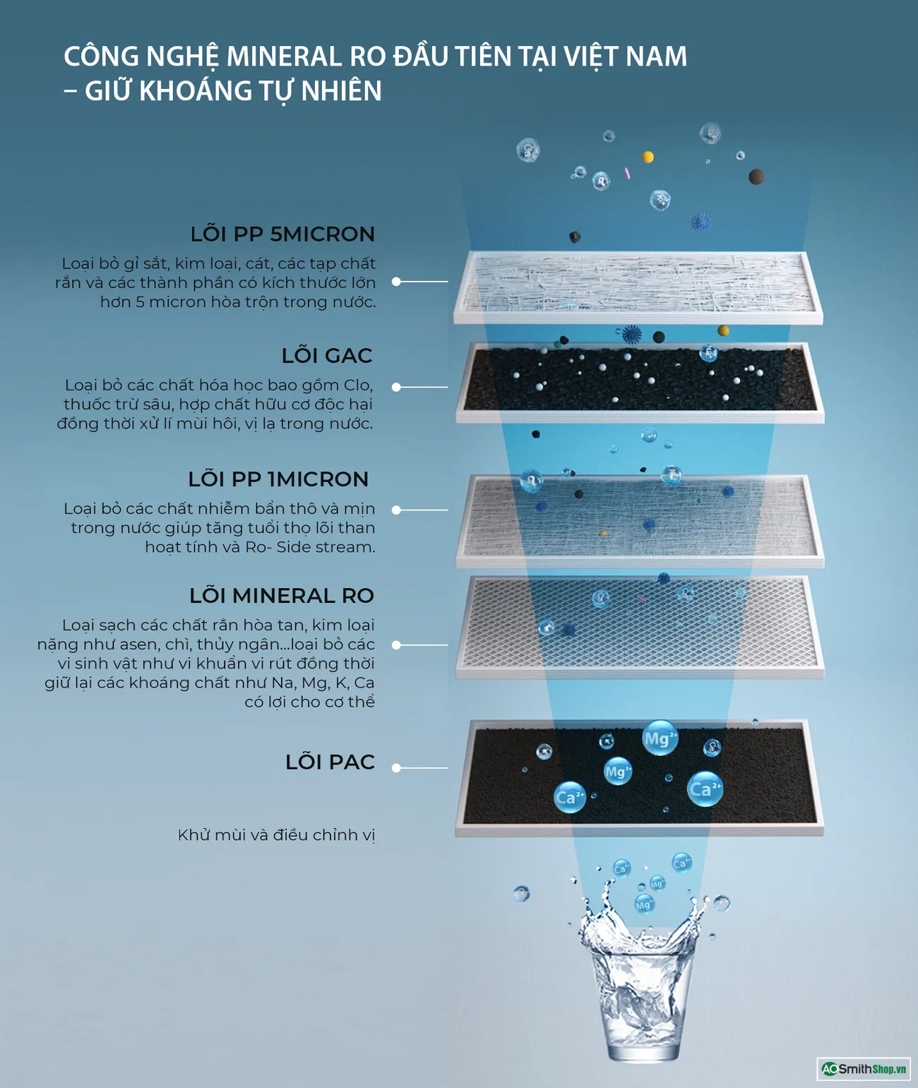 Màng lọc Mineral RO Phát minh đột phá của A. O. Smith, máy lọc nước công nghệ RO đầu tiên tại Việt Nam có khả năng loại bỏ hiệu quả các chất có hại trong nước (Asen, Chì, Thủy Ngân…) đồng thời giữ lại các khoáng chất tự nhiên có lợi cho cơ thể. |