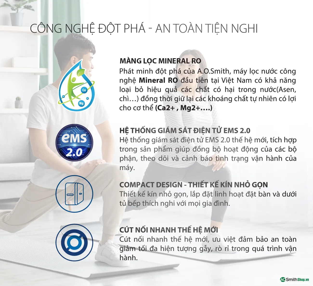 Hệ thống kiểm giám sát điện tử EMS 2.0 Hệ thống giám sát điện tử EMS 2.0 thế hệ mới của A. O. Smith tích hợp trong sản phẩm giúp đồng bộ hoạt động của các bộ phận, theo dõi và cảnh báo tình trạng vận hành của máy. |