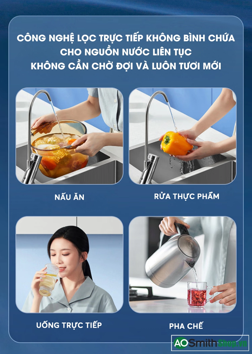 Công nghệ lọc trực tiếp đảm bảo nguồn nước tươi mới và hệ thống lõi lọc nguyên khối giúp ngăn ngừa rò rỉ.